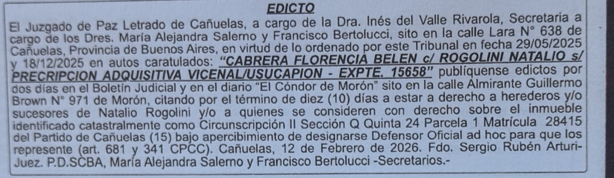 Publicación de edicto judicial por dos días correspondiente en Autos: " “CABRERA FLORENCIA BELEN c/ ROGOLINI NATALIO s/ PRESCRIPCION
