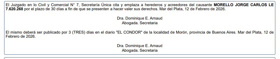 Publicación por 3 días correspondiente a Sucesión " MORELLO JORGE CARLOS LE 7.620.268" EL CÓNDOR: 18, 19 Y 20/02/2026.-