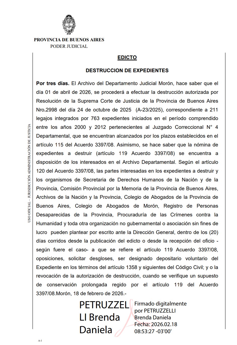 EDICTO JUDICIAL: DESTRUCCION DE EXPEDIENTES