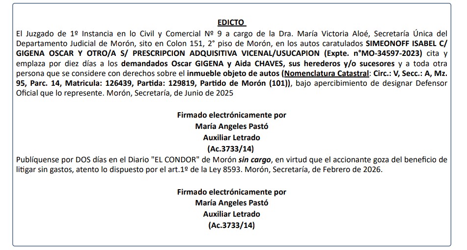 Publicación por dos (2) días de EDICTO JUDICIAL correspondiente en Autos: " SIMEONOFF ISABEL C/GIGENA OSCAR Y OTRO/A S/