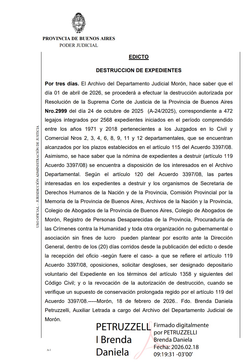 Publicación por 3 días correspondiente a DESTRUCCION DE EXPEDIENTES. El Archivo del Departamento Judicial Morón, hace saber que el