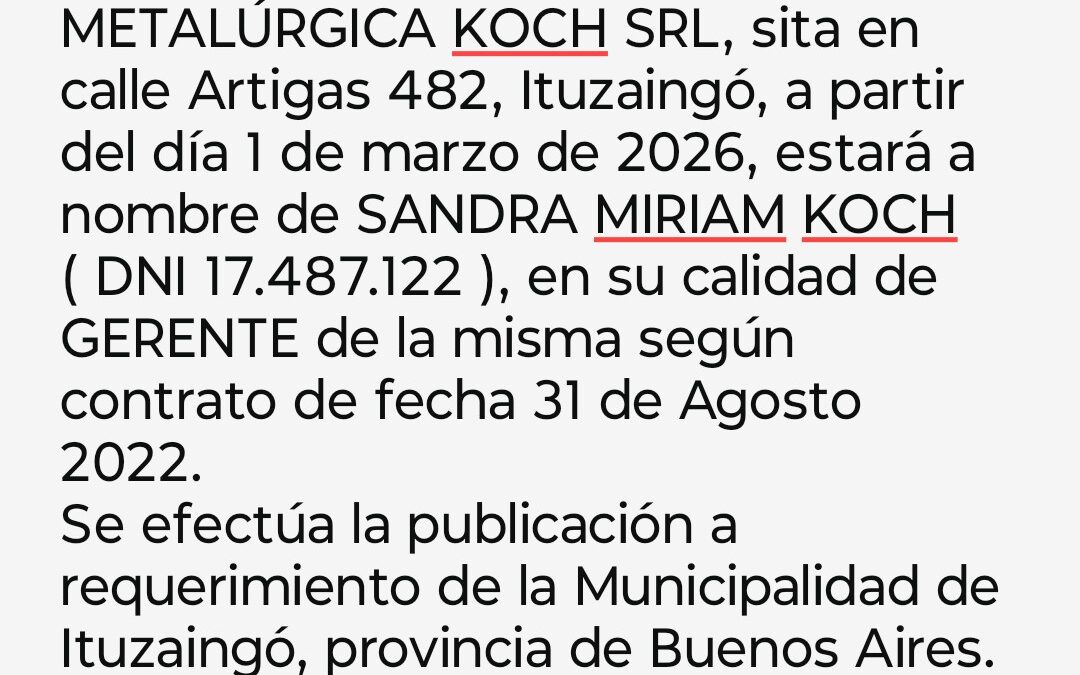 METALURGICA KOCH SRL-CUIT 30 71242828 3- HABILITACIÓN Y TRANSFERENCIA DE TITULARIDAD EL CÓNDOR: 3, 4, 5, 6 Y 9/03/2026.-