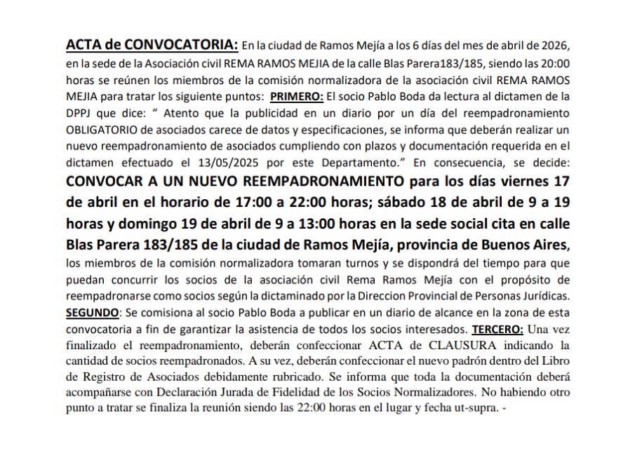 Publicación por un día correspondiente a Asociación civil REMA RAMOS MEJIA- ACTA de CONVOCATORIA- EL CÓNDOR: 9/04/2026.-