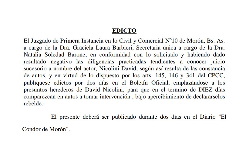 Publicación de edicto judicial por dos días correspondiente a citación " presuntos herederos de David Nicolini..." EL CÓNDOR: 16 y 17/04/2026.-