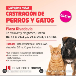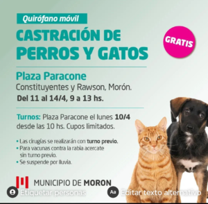 Allí se podrán realizar castraciones a perros y gatos de manera gratuita con turno previo. Cupos limitados!