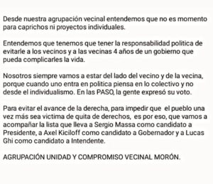 Tras un comunicado de prensa, y por intermedio de su referente @emmanuel_albonoz, la @agrupacion_vecinal_moron ratificó que van a acompañar la lista de @sergiomassaok @kicillofok y lucas.ghi @munidemoron .