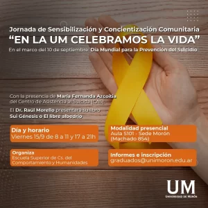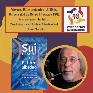 En el marco del 10 de septiembre: Día mundial para la prevención del Suicidio, y con la especial presencia de la Lic. María Fernanda Azcoitia, del Centro de Asistencia al Suicida ( CAS), el viernes 15 de septiembre a las 19.30 hs, el Dr. RAÚL MORELLO, de Escenarios Saludables, presentará su último libro: “SUI GÉNESIS o del Libre Albedrío”, donde relata de un modo muy particular el itinerario de la asociación.