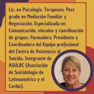 Previamente a las 1830, la Lic. María Fernanda Azcoitia, del Centro de Asistencia al Suicida ( CAS), brindará una charla.