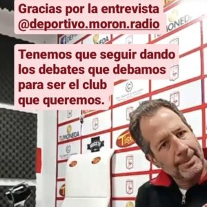 Finalmente, concluye con una reflexión sobre la elección que se hará a fin de año en Deportivo Morón: “Nosotros vamos a ir a un proceso electoral como corresponde. En términos personales, estoy convencido que si alguien debe continuar es El Conejo (Gabriel Mansilla, actual presidente). El único que duda es él, pero porque siempre planteó que iba a estar un solo mandato, pero creo que se dió cuenta que con tan solo uno, no va a poder terminar la obra que él empezó”.