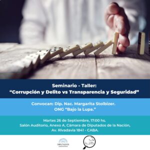 Convocado por la Diputada Nacional Margarita Stolbizer y la Asociación Civil «Bajo la Lupa» – hoy martes 26 de septiembre a las 17.00 hs. en el Salón Auditorio de la H. Cámara de Diputados de la Nación Argentina, Av. Rivadavia 1841- CABA, se llevará a cabo el SEMINARIO- TALLER: “CORRUPCIÓN Y DELITO VS TRANSPARENCIA Y SEGURIDAD”