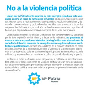 Lleva el título del comunicado de prensa que @unionporlapatriamoron hizo llegar a nuestra redacción con motivo de solidarizarse con el espacio de Juntos por el Cambio Morón, ante el hecho vandálico ocurrido en el día de hoy, en el local partidario de Morón Sur.