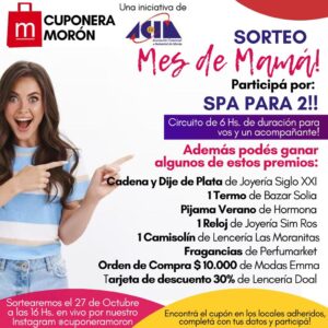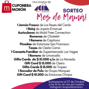 La cámara comercial de Morón @camaracomerciomoron organizó una campaña para el Dia la de Madre que consiste en un sorteo, donde cada negocio adherido entregará cupones a sus clientes para participar en el sorteo que se realizara el 27 de octubre a las 16 hs por instagram @cuponeramoron.