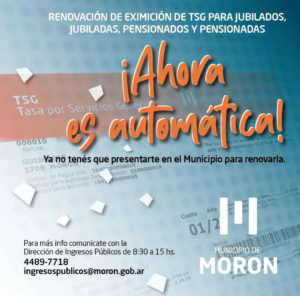 En Morón, ya no es necesario que los jubilados, jubiladas, pensionados y pensionadas se presenten en el @munidemoron para realizar el trámite de renovación de eximición de TSG porque es automática.
