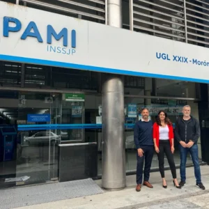 Ariel Diwan, Marina Cejas y Diego Llaneza en la puerta de la delegación PAMI MORON