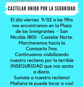 Organizado por instituciones, comerciantes, vecinos autoconvocados y familiares víctimas de la inseguridad entre otros, el próximo viernes 9 a las 19 hs, se llevará a cabo una nueva marcha CASTELAR UNIDO POR LA SEGURIDAD.