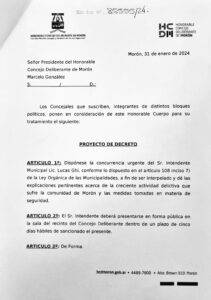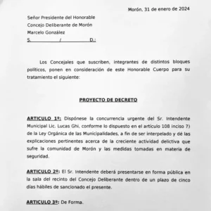 Recordemos que el pasado 31 de enero, 13 concejales presentaron un Proyecto de Decreto – INTERPELACIÓN AL INTENDENTE- solicitando que el jefe comunal Lucas Ghi, «se presente en el recinto del @hcd.moron y dé explicaciones de la