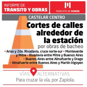 Por obras de bacheo, el @munidemoron informa que se llevan a cabo cortes de calles alrededor de la estación de CASTELAR.