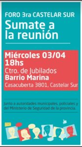 Hoy miércoles 3 de abril a las 18 hs en las instalaciones del Centro de Jubilados Barrio Marina de Castelar Sur, Casacuberta 3801, se llevará a cabo la segunda Convocatoria Abierta de Seguridad, para que los vecinos y vecinas, comerciantes y empresarios puedan participar, hacer sus comentarios, sugerencias, consultas y solicitudes.