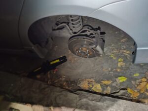 El robo de neumático, también en el Club Mariano Moreno, miércoles por la noche, así encontró el auto un socio que salía de realizar su actividad en el club.