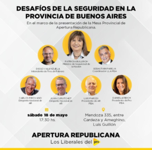 Patricia Bullrich junto con Diego Valenzuela, intendente de Tres de Febrero, Sebastián Pareja, coordinador de La Libertad Avanza en PBA, Juan Curutchet, Carlos Pirovano, Luis Parodi y Daniela Reich participarán en el marco de la presentación de la Mesa Provincial de Apertura Republicana.