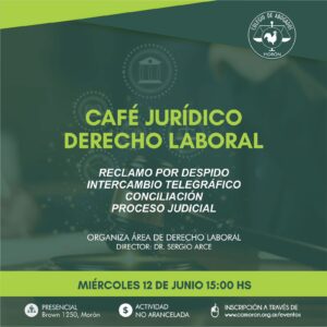 Mañana miércoles 12/06 a las 15:00 hs, en la sede del @colegioabogadosmoron se llevará a cabo una nueva convocatoria de 𝐂𝐀𝐅𝐄́ 𝐉𝐔𝐑𝐈́𝐃𝐈𝐂𝐎 DERECHO 𝐋𝐀𝐁𝐎𝐑𝐀𝐋: » Estrategias y cuestiones prácticas del Reclamo por Despido»