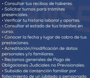 Consultar sus recibos de haberes, solicitar turnos para trámites presenciales, verificar la historia laboral y aportes, consultar el estado de trámites » en curso» , conocer las fechas y lugar de cobros de prestaciones, acreditación/ modificación de datos personales y/ familiares, reclamos generales de pago de obligaciones judiciales no previsionales , y subsidio de contención familiar por fallecimiento de un jubilado o pensionados, ….entre otros.