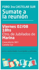 El próximo viernes 2 de agosto a las 18 hs en las instalaciones del Centro de Jubilados Barrio Marina de Castelar Sur, Casacuberta 3801, se llevará a cabo una nueva Reunión Abierta de Seguridad, para que los vecinos y vecinas, comerciantes y empresarios puedan participar presencialmente, hacer sus comentarios, sugerencias, consultas y solicitudes.