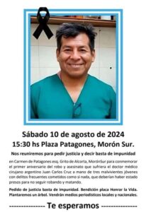 primer aniversario del robo y asesinato que sufriera el doctor médico cirujano argentino Juan Carlos Cruz a manos de tres malvivientes jóvenes con delitos frecuentes cometidos como si nada, que deberían haber estado presos para no seguir robando y matando.»