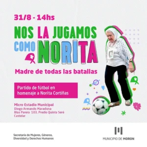 El @munidemoron @lucasdelwest organizará, este sábado 31 de agosto, un partido de fútbol para homenajear a Nora Cortiñas en el Microestadio Municipal Diego Armando Maradona (Blas Parera 103, Predio Quinta Seré, Castelar). Además, durante la jornada habrá espectáculos musicales, charlas y espacios de reflexión.