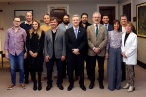 Junto a Longhi estuvieron presentes los notarios Maximiliano Molina, Vicepresidente 1º; Carina Pérez Lozano, Secretaria de Gobierno; Agustín Sáenz, Secretario de Relaciones Institucionales; Andrés Martínez, Secretario de Informática; y Zulma Dodda, Consejera e integrante de la comisión de asesores registrales.