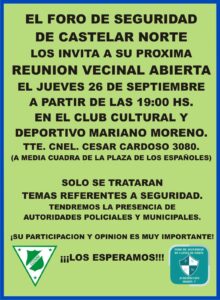 El próximo jueves 26 de septiembre a las 19:00 hs en las instalaciones del Club Cultural y Deportivo MARIANO MORENO, Cardoso 3080, se llevará a cabo una nueva Reunión Abierta de Seguridad, para que los vecinos y vecinas, comerciantes y empresarios puedan participar presencialmente, hacer sus comentarios, sugerencias, consultas y solicitudes.