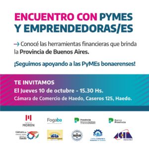 Organizado por la Secretaria de Producción del Municipio de Morón bajo la conducción de Santiago Muñiz @santi_muniz_ @munidemoron conjuntamente con la Cámara de Comercio, Industria y Servicios de Haedo @camaradehaedookbajo la presidencia de Jorge Costas @jorgecostas, se llevará a cabo el » ENCUENTRO CON REPRESENTANTES DE PYMES, COMERCIANTES, EMPRENDEDORAS Y EMPRENDEDORES» el próximo jueves 10 de octubre a las 15.30 hs en la sede de la cámara local, Caseros 125, Haedo.