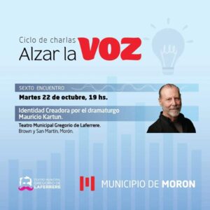 Teatro Municipal Gregorio de Laferrere* (Brown y San Martín, Morón centro)@el_laferrere se llevará a cabo la sexta edición del ciclo de charlas » Alzar la voz» , el dramaturgo y director de teatro @mauriciokartun hablará sobre Identidad creadora.