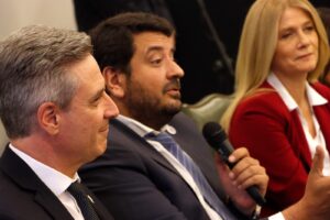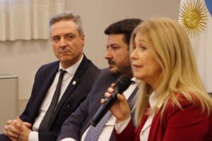 Guillermo Longhi, Presidente del colegio de Escribanos de la Provincia de Buenos Aires, el Ministro de Justicia y Derechos Humanos, Juan Martín Mena. @juanmartinmena , y la Vicegobernadora de la Provincia de Buenos Aires, Verónica Magario.
