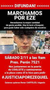 Mañana sábado 2 a partir de las 9 de la mañana, en Pres. Perón 7521, familiares, compañeros y compañeras del colegio, amigos y vecinos marcharán pidiendo «JUSTICIA POR EZEQUIEL».