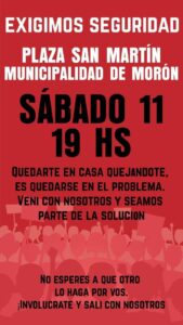 Este sábado 11 de Enero a las 19 hrs vecinos autoconvocados se concentraran frente al Municipio de Morón @munidemoron para exigir a las autoridades locales que accionen mayores medidas de seguridad para hacer frente a la ola de inseguridad que sucede en el distrito.