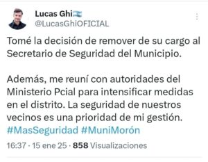 El jefe comunal @munidemoron @lucas.ghi comunicó oficialmente el despido de Andrés Rodríguez, secretario de Seguridad, en medio de la tremenda ola de inseguridad que se vive en el distrito.