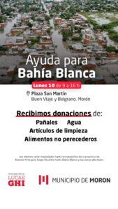«Desde el Municipio de Morón @munidemoron coordinamos con la Provincia para ayudar a nuestros hermanos bahienses. Es por eso que este lunes 10 de marzo, en la Plaza San Martín (Buen Viaje al 900) recibiremos donaciones 9 a 16 hs.»