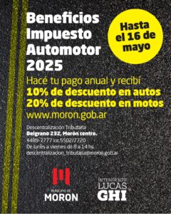 El Municipio de Morón @munidemoron habilitó la opción de pago anticipado del Impuesto Automotor 2025, con importantes beneficios para quienes opten por esta modalidad. Las vecinas y vecinos que realicen el pago anual antes del 16 de mayo obtendrán un 10% de descuento en el caso de automóviles y un 20% en motocicletas.