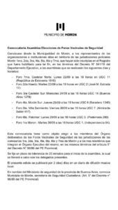 Convócase desde la Municipalidad de Morón, a los representantes de las organizaciones e instituciones sitas en territorio de las jurisdicciones policiales Morón 1era, 2da, 3ra, 4ta, 5ta, 6ta y 7ma, que hayan sido inscriptas en el Registro que fuera habilitado para tal fin, en los términos del Decreto N° 841/16 del Departamento Ejecutivo, a las asambleas que se realizarán los siguientes días y horarios: