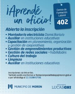 Con el objetivo de brindar más herramientas para la inserción laboral, el Municipio de Morón invita a vecinos y vecinas a inscribirse en los cursos que se dictarán en el Centro de Formación Laboral N° 402.