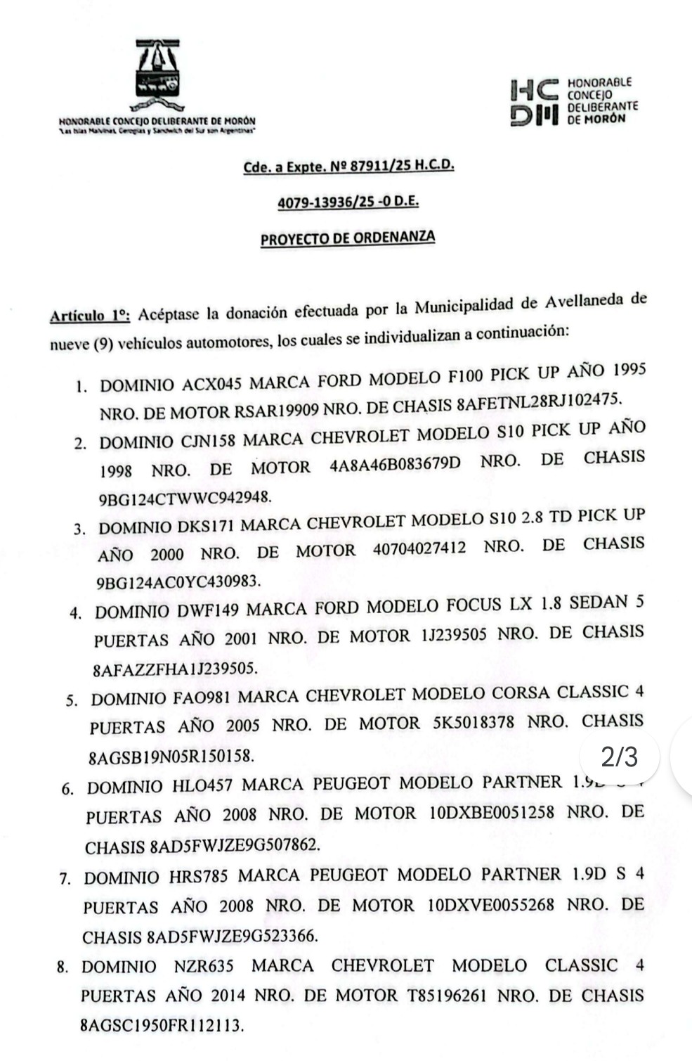 Uno de los temas centrales fue la aprobación de la donación de nueve (9) vehículos por parte de la Municipalidad de Avellaneda al Municipio de Morón, destinados a reforzar la Secretaría de Seguridad Ciudadana. La votación resultó con 18 votos afirmativos, cuatro negativos del bloque de La Libertad Avanza (LLA) y la abstención de la Unión Cívica Radical (UCR).