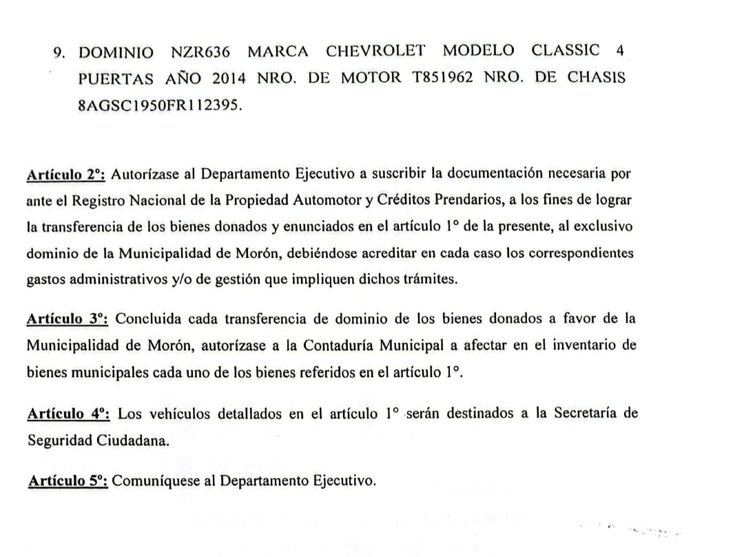 MORÓN: FUERTES CRUCES EN EL HCD TRAS EL RECHAZO DE LA LIBERTAD AVANZA  A LA DONACIÓN DE 9 VEHÍCULOS PARA SEGURIDAD