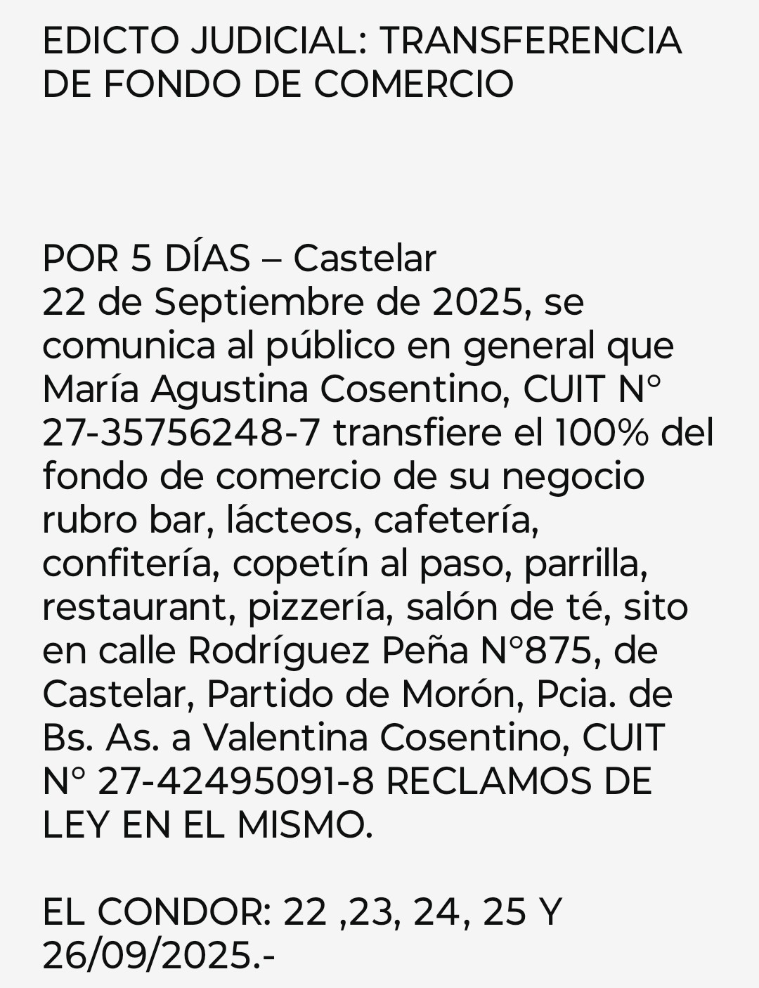 22 de Septiembre de 2025, se comunica al público en general que María Agustina Cosentino, CUIT N° 27-35756248-7 transfiere el 100% del fondo de comercio de su negocio rubro bar, lácteos, cafetería, confitería, copetín al paso, parrilla, restaurant, pizzería, salón de té, sito en calle Rodríguez Peña N°875, de Castelar, Partido de Morón, Pcia. de Bs. As. a Valentina Cosentino, CUIT N° 27-42495091-8 RECLAMOS DE LEY EN EL MISMO.