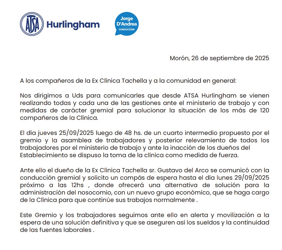 Desde ATSA Hurlingham señalaron, tras un comunicado de prensa el día de hoy, que «el objetivo es encontrar una salida que permita normalizar la actividad de la clínica, garantizar el pago de salarios y asegurar la continuidad de las más de 120 fuentes laborales vinculadas al centro de salud.»