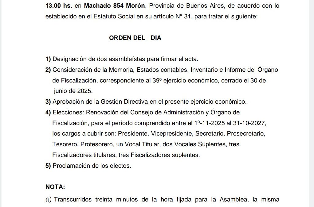 Morón, a la Asamblea Ordinaria a realizarse el día 31 de octubre de 2025 a las 13.00 hs. en Machado 854 Morón, Provincia de Buenos Aires, de acuerdo con lo