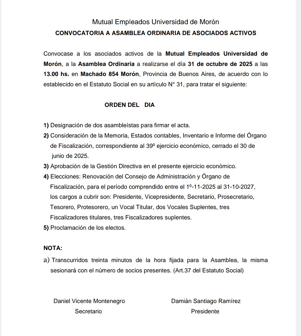 MUTUAL EMPLEADOS UNIVERSIDAD DE MORÓN- CONVOCATORIA A ASAMBLEA ORDINARIA DE ASOCIADOS ACTIVOS-