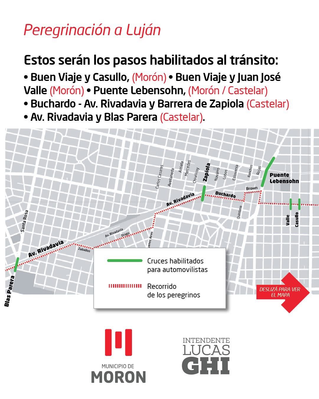 Además, para asistir a las y los peregrinos, el Gobierno local dispondrá de puestos de hidratación, postas de sanidad y enfermería, baños químicos, así como presencia de Defensa Civil y SAME en distintos puntos del tramo que atraviesa el partido de Morón.
