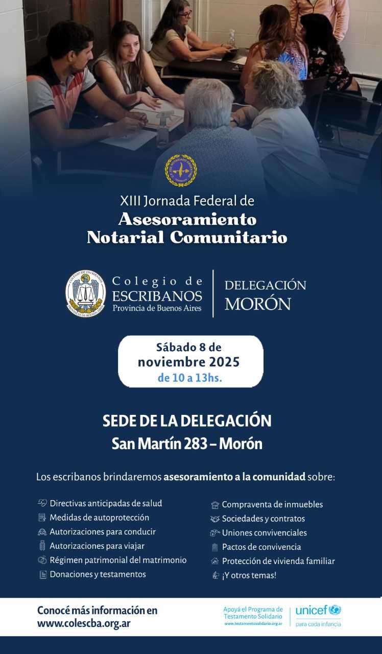 En el distrito de Morón, la actividad se llevará a cabo por la Delegación local del Colegio de Escribanos de la Provincia de Buenos Aires, presidida por el Esc. Patricio Villamayor, en la sede de la Delegación, ubicada en San Martín 283, Morón, de 10 a 13 horas, donde escribanos y escribanas brindarán asesoramiento personalizado y gratuito a los ciudadanos.