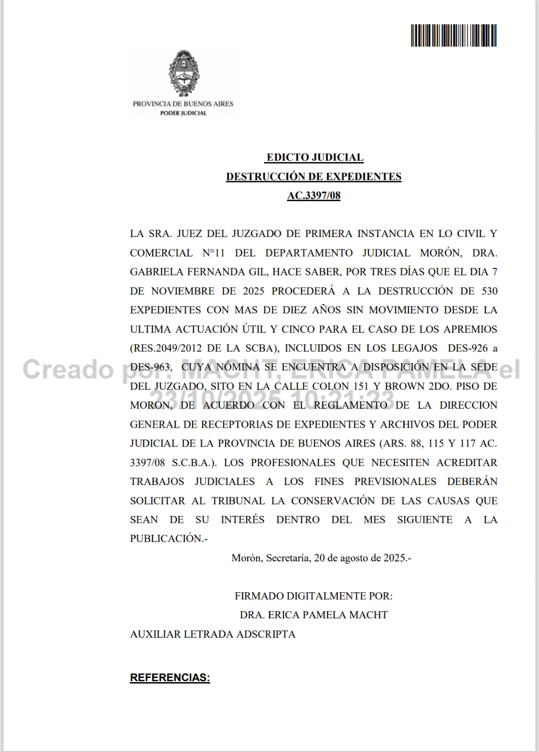 LA SRA. JUEZ DEL JUZGADO DE PRIMERA INSTANCIA EN LO CIVIL Y COMERCIAL N° 11 DEL DEPARTAMENTO JUDICIAL MORÓN, DRA. GABRIELA FERNANDA GIL, HACE SABER, POR TRES DÍAS QUE EL DÍA 7 DE NOVIEMBRE DE 2025 PROCEDERÁ A LA DESTRUCCIÓN DE 530 EXPEDIENTES CON MÁS DE DIEZ AÑOS SIN MOVIMIENTO DESDE LA ÚLTIMA ACTUACIÓN ÚTIL Y CINCO PARA EL CASO DE LOS APREMIOS (RES. 2049/2012 DE LA SCBA), INCLUIDOS EN LOS LEGAJOS DES-926 A DES-963, CUYA NÓMINA SE ENCUENTRA A DISPOSICIÓN EN LA SEDE DEL JUZGADO, SITO EN LA CALLE COLÓN 151 Y BROWN 2DO. PISO DE MORÓN, DE ACUERDO CON EL REGLAMENTO DE LA DIRECCIÓN GENERAL DE RECEPTORÍAS DE EXPEDIENTES Y ARCHIVOS DEL PODER JUDICIAL DE LA PROVINCIA DE BUENOS AIRES (ARS. 88, 115 Y 117 AC. 3397/08 S.C.B.A.). LOS PROFESIONALES QUE NECESITEN ACREDITAR TRABAJOS JUDICIALES A LOS FINES PREVISIONALES DEBERÁN SOLICITAR AL TRIBUNAL LA CONSERVACIÓN DE LAS CAUSAS QUE SEAN DE SU INTERÉS DENTRO DEL MES SIGUIENTE A LA PUBLICACIÓN.-